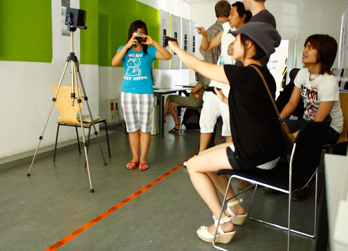 Bei der Jahresausstellung – gut zu sehen sind die Infrarot-Reflektoren am Kopf und an den Händen.