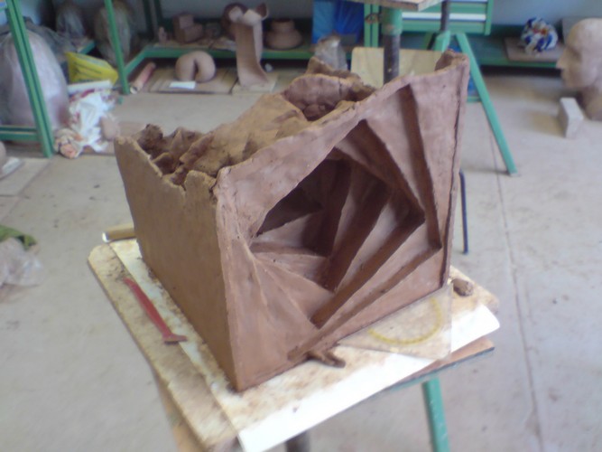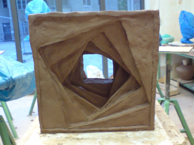 Die spiralartige Negativform setzte ich als Würfel mit 20 cm Kantenlänge in Ton um.