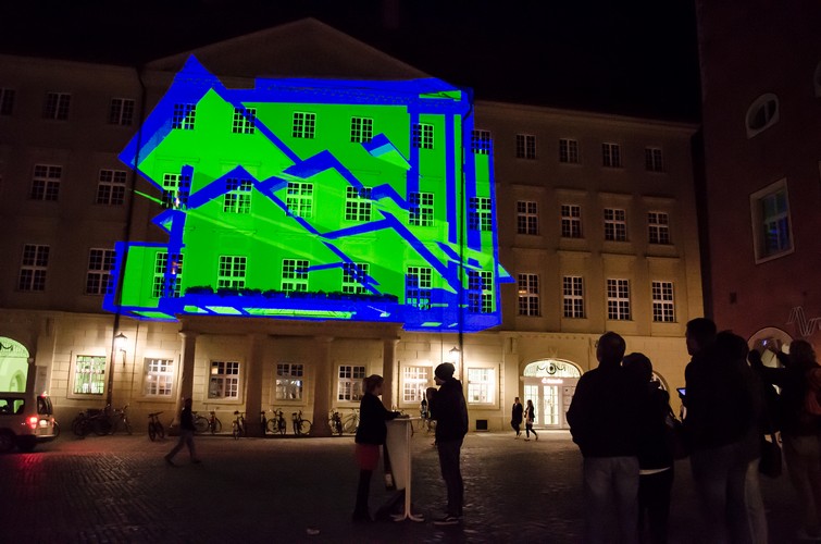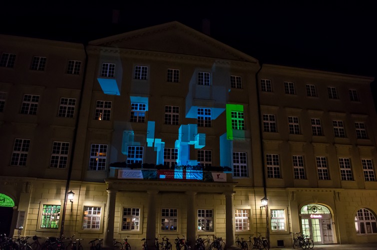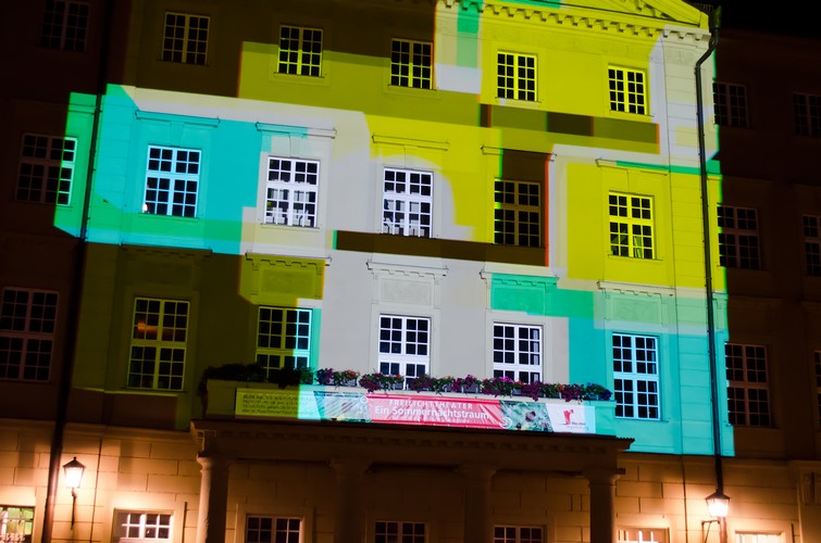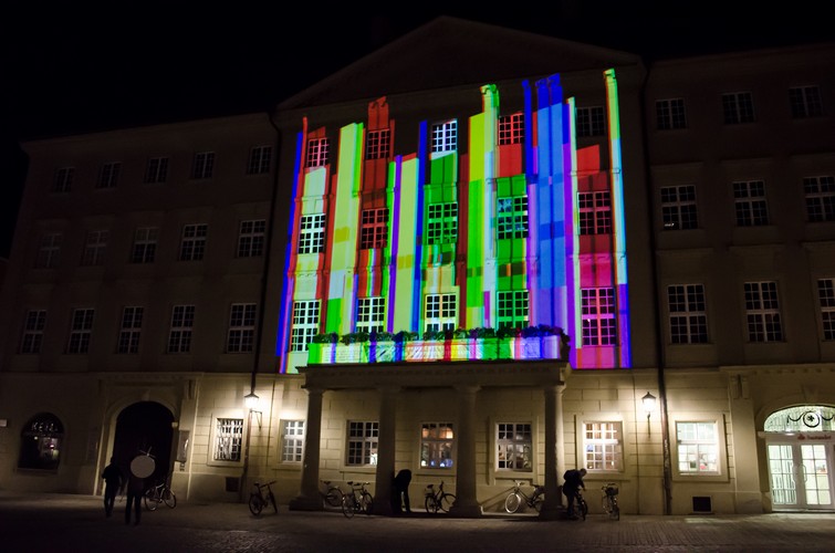 Interaktives Lichtspiel mit Farbtönen, Farbklängen, Proportionen, Rhythmen und Kompositionen an der Fassade des Thon-Dittmer-Palais im historischen Stadtraum von Regensburg.